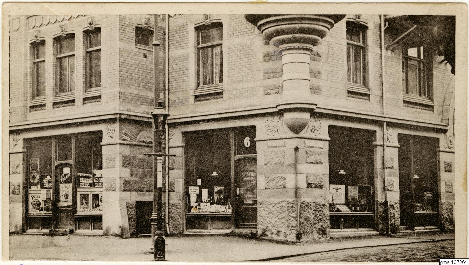 Reklam för Oscar Hellström Speceri, konserv, delikatess och vinaffär. Foto på framsidan text på baksidan