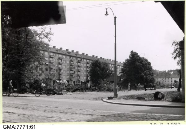 Fastigheter på västra sidan av Kobbarnas väg sedda från Olskroksmotet. I förgrunden parti av Gubbero egendoms gamla park skattar åt förgängelsen för nya EPA-huset vid Olskrokstorget.