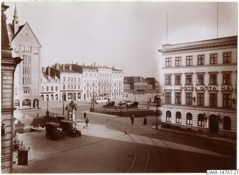 Vy över Hotellplatsen från söder. Hotel Göta Källare till höger och i bildens mitt Hotell Eggers och SJ järnvägsstation.