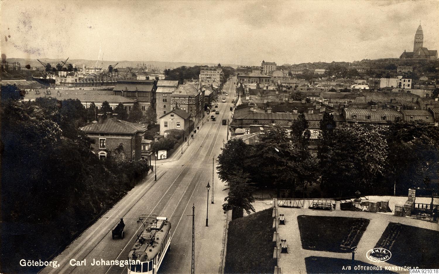 Sträckningsbild av Karl Johansgatan mot öster, i höjd med Karl Johanskyrkan. Fotografen har stått på balkong/i fönster Allmänna vägen 52. Längs Karl Johansgatan norra sida syns nr 32 den tidigare prästbostaden för Karl johans församling, i bildens mitt Bryggeriet Kronan. Ute vid älven anas Amerikaskjulet. I bildens övre högra hörn ligger Masthuggskyrkan. I nedre högra hörnet ser man John E Olsons plats (före detta Bataljonsparken och Lek- och Viloplatsen). I parkens övre kant syns Eric Grates Bergslagurna, ett av 10 exemplar från 1921-1922. Ett exemplar finns på Göteborgs konstmuseum.