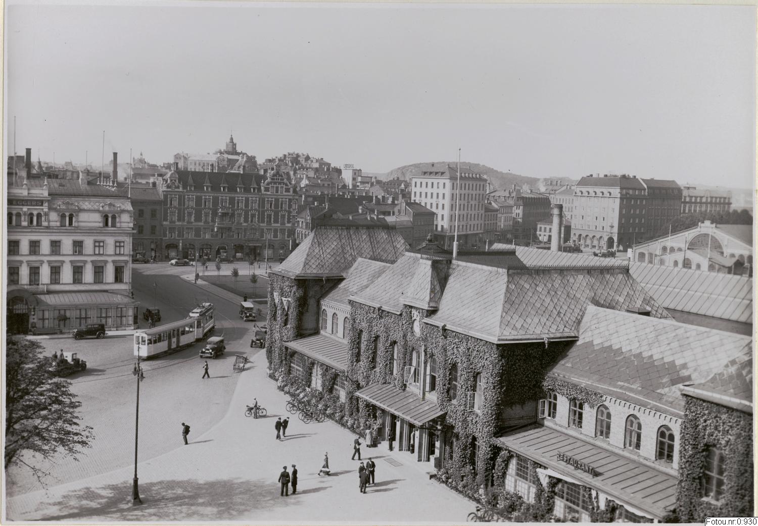 Vy över Drottningtorget mot väster. Till höger Statens Järnvägars stationshus, vid nedre kanten ser man nya restaurangen. Till vänster ser man Hotel Eggers.