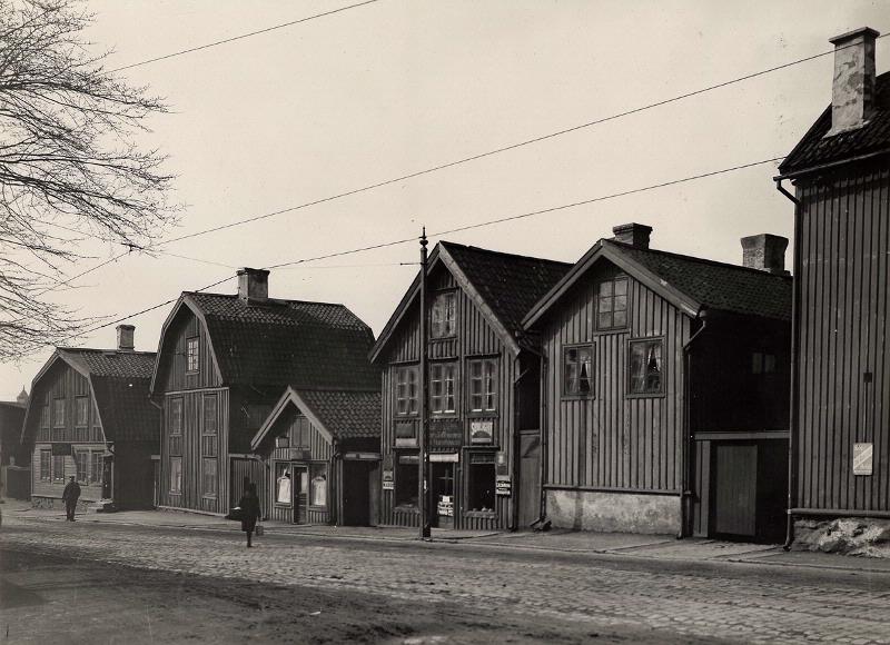 Sträckningsbild Karl Johansgatan från höger nr 75, 73 och 71. I mittenhusen finns speceriaffär, frisersalong.