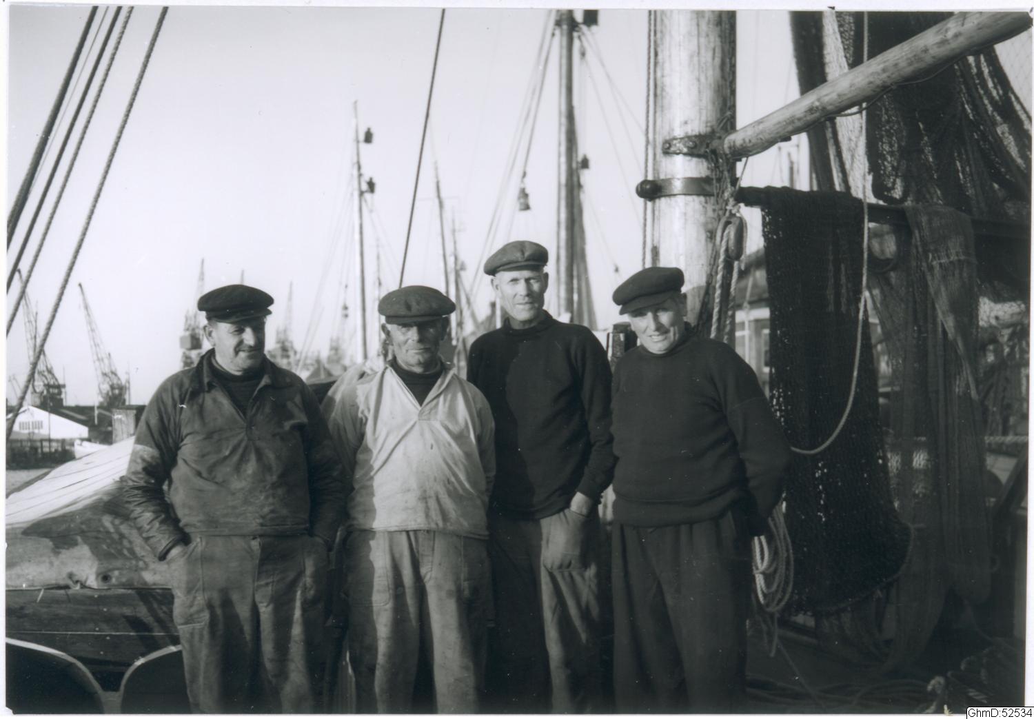 4 stycken fiskare ombord på fiskebåt i Fiskhamnen.
