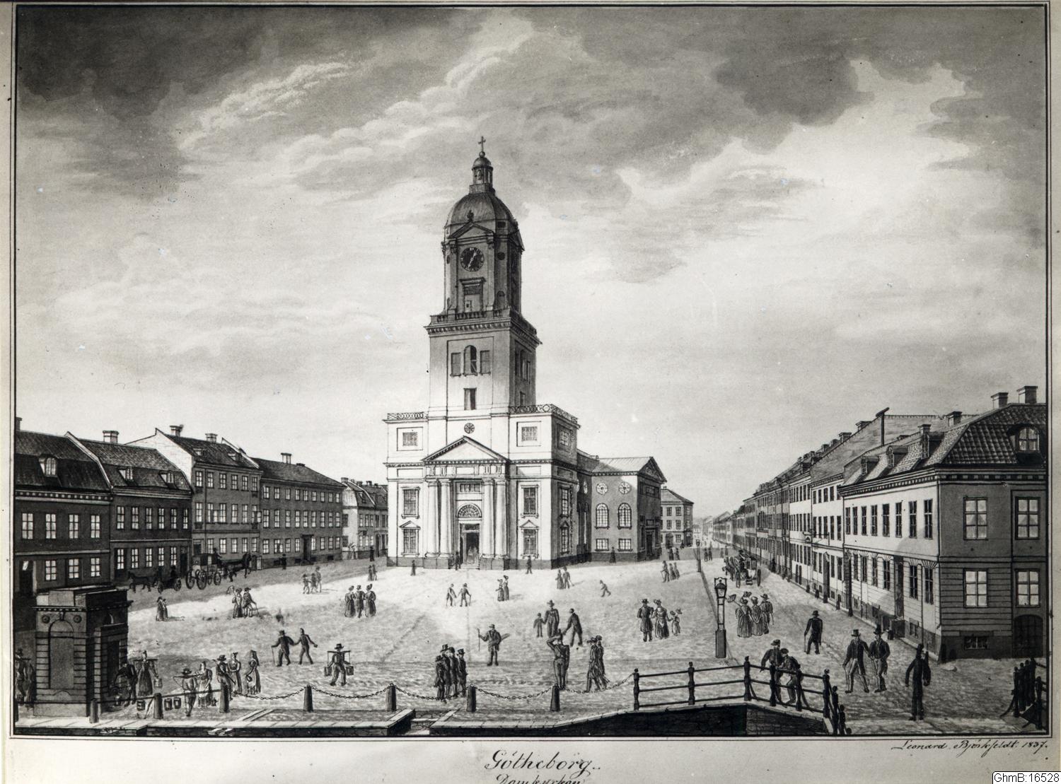 Domkyrkoplatsen 1837, till vänster i bilden hämtar män och kvinnor vatten med ok. Till höger Kungsgatan