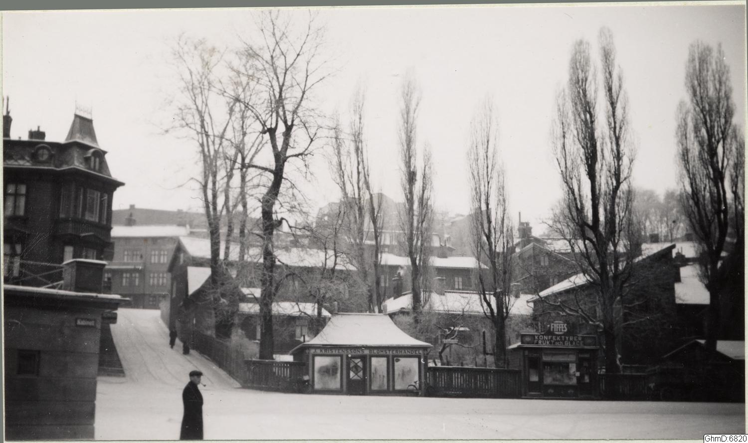 Rangströmsliden/Andra Långgatan 44 längst till vänster. I mitten Rangströmska trädgården, mot Andra Långgatan ligger J Kristenssons Blomsterhandel. Mot höger finns en kiosk/konfektyraffär, med reklam för Fyffes bananer. Konfektyraffären har under en period gått under namnen Sjappet.