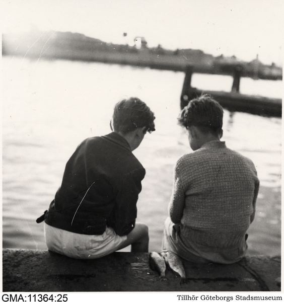 Göteborgs hamn: Masthuggskajen. Fiskande pojkar vid flodsprutan, omkring år 1947.