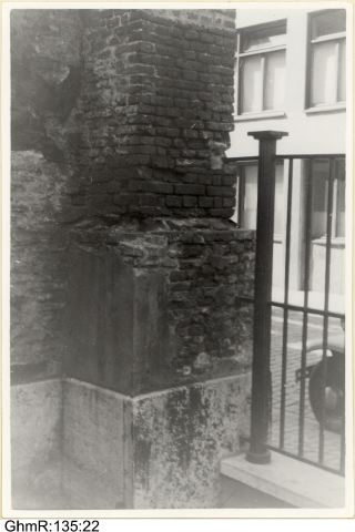 Östra fasadens norra hörnkontrefort vid Kronhusgatan. Bilden visar hur tegellisten blivit ommurad med tegel av annat format än det som förekommer i murarna. Anm. De ljusa fogarna i bildens överdel är ett fogprov, som gjorts under nu pågående arbeten.
