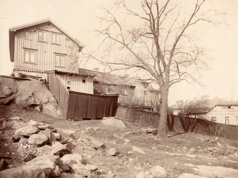 Kjellmansgatan, fr.v Majornas 5:e rote nr 10B, 10A och nr 9 sedda från öster. Huset utanför staketet till höger ligger på Stigbergsgatan.