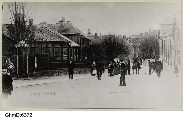 Gamla hus på Gathenhielmska trädgårdens område- där förut Stigbergstorget 8 (skandalhuset) låg, nu tomt för Oceanografiska institutet. "Lefins fotoatelier" t.v. Efter vykort. 1893.