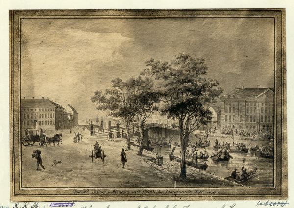 Kämpebron med Ostindiska Kompaniets byggnad. Akvarell konturetsning.
