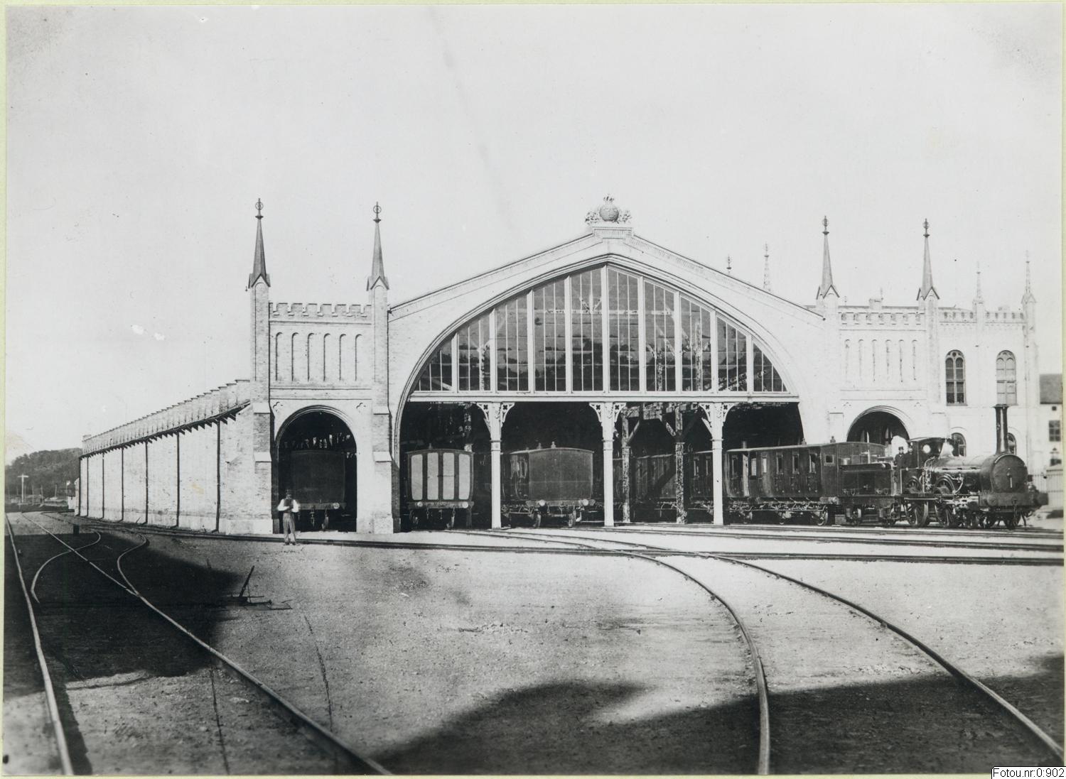 Staten järnvägars station med banhallens fasad och bangården mot öster vid Nils Ericsonsplatsen.