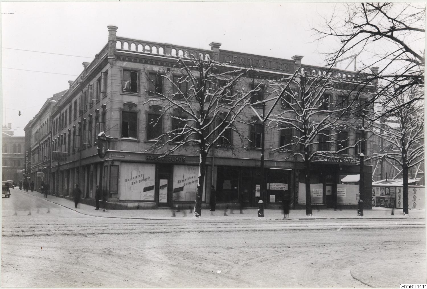 Centralen, fastighet med butiker och annan verksamhet så som syatelje och fotograf. Bilden tagen strax innan rivning, förmodligen 1935.