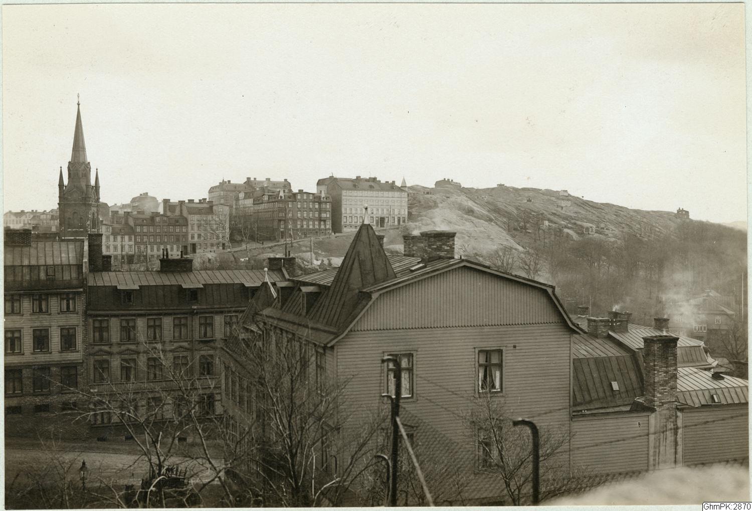 Utsik mot söder, från Redbergsparken. På berget ses bebyggelse inom stadsdelen Lunden. Mäster Johansgatan går upp emot bergskrönet och man ser även Karlagatan svänga upp mot söder från densamma. Mäster Johansgatan hette Ranbergsgatan innan Lunden införlivades med Göteborg 1922.