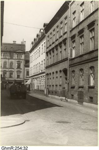 Lilla Drottninggatan sedd fr. Stora Nygatan mot Östra Larmgatan. På högra sidan fr.v. nr. 2 (vitt hus), 4 samt del av fastigheten Stora Nygatan 15 x Lilla Drottninggatan.