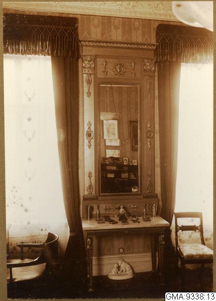 Bilden ur album från Emil Haglunds hem. Interiörbild, samma rum som GMA:9338:11-12. Mellan fönstren spegel och konsolbord i empirestil, tillverkning troligen Bylander, Per Gustav. Under konsolbordet porlinsfigurin, "Kan du inte tala".