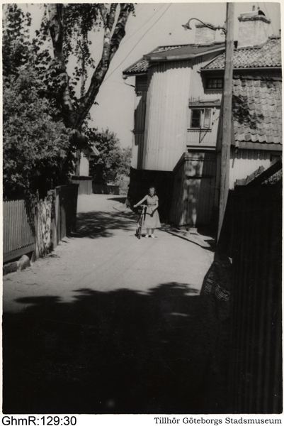 Hellstedtsgatan mot Amiralitetsgatan. Till höger syns liten del av Hellstedtsgatan 2 samt baksidan av huset Mariebergsgatan 15 A.