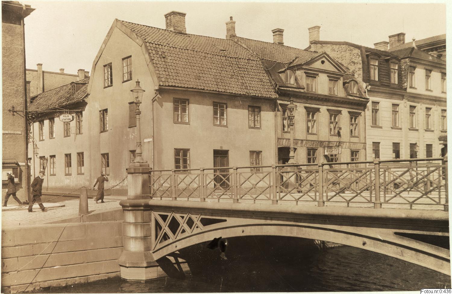 Vy från Östra Hamngatan med Spannmålsgatubron i fokus. Till vänster i bild syns hörnet på Östra Hamngatan 11, polisstation under åren 1892-1967.