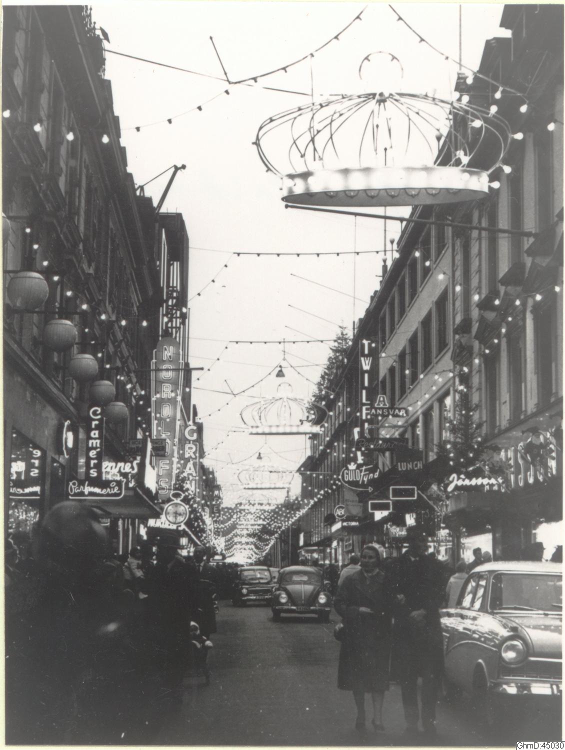 Kungsgatan i skygmning med juldekoration. Lite längre bort på höger sida skymtar man Grand Bazar, på Kungsgatan 49.