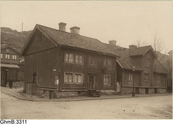 Fjällgatan går upp till vänster. Situationen i övrigt från vänster till höger: Majornas 3 rote, nr 112, 111 o. 110 B.