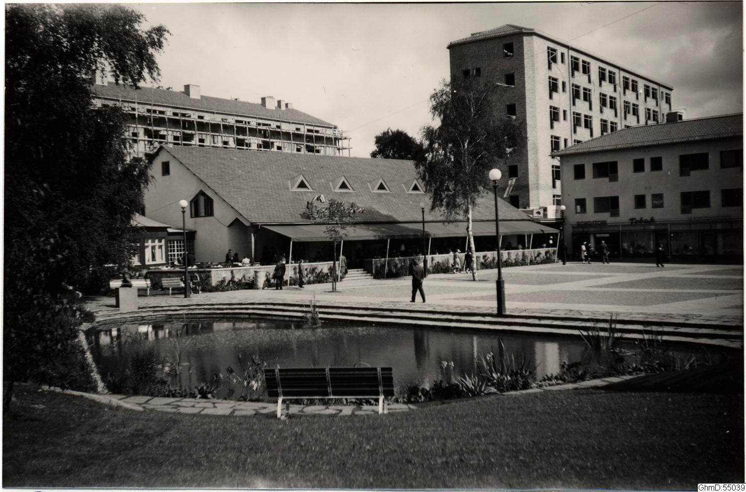 Vy över det nyanlagda Guldhedstorget och restaurang Guldheden med uteservering. I bakgrunden pågår byggnation av bostadshus.