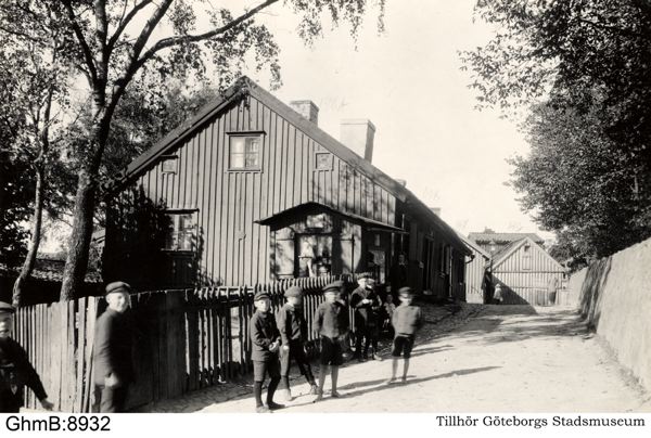 Kabelgatan mellan Timmermansgatan och Galateagtan, t.h. muren till Mariebergs kyrkogård. T.v. Majornas 1 rote, nr 198A, 198 och 197. Rakt fram nr. 196.
