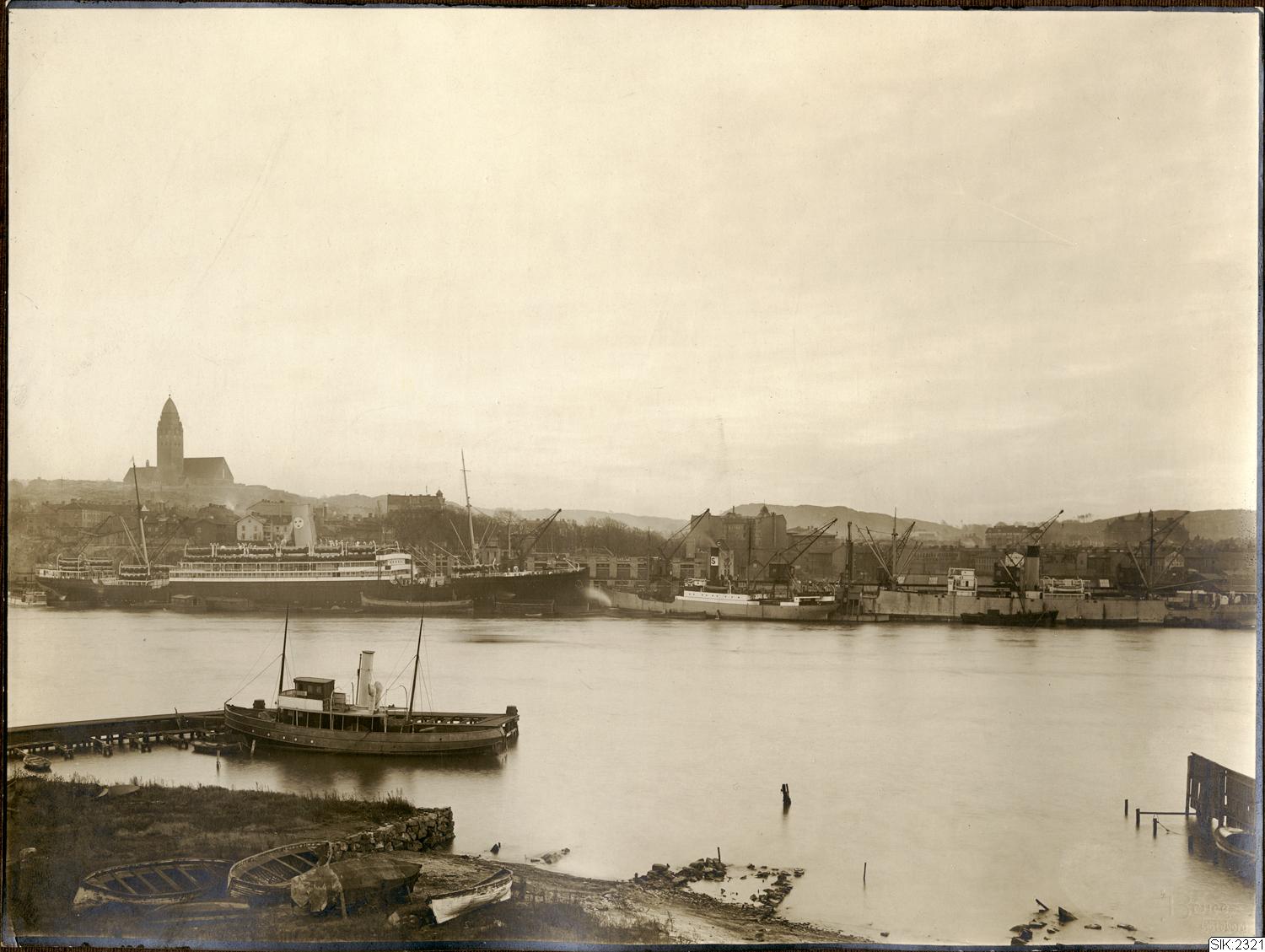 Göta älv och Göteborgs hamn mot söder. Bilden tagen från norra sidan om älven på stranden vid Lindholmen. Ångfartyget till vänster i bild nedanför Masthuggskyrkan är SS Drottningholm, ett av Svenska Amerika Linjens fartyg. Bakom hennes för skymtar Amerikaskjulet.