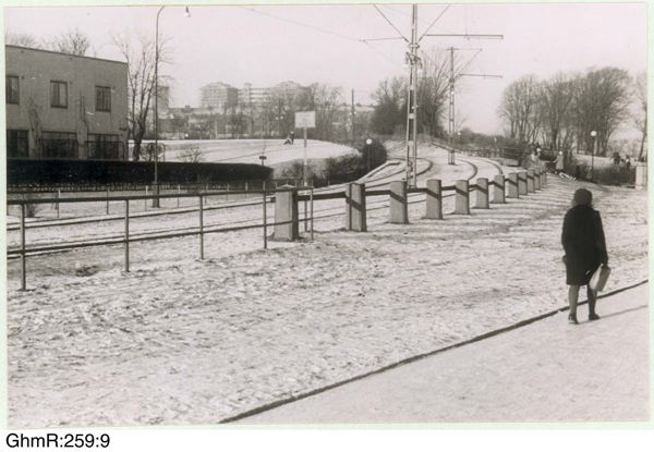 Munkebäcksgatan, parti av norra sidan strax väster om Torpagatan.Sett mot norr. I fonden höghusbebyggelse på Strömmensberg/Strömmens berg (Kyrkåsen). T.v. uppfart för spårvägen mot Härlandavägen.