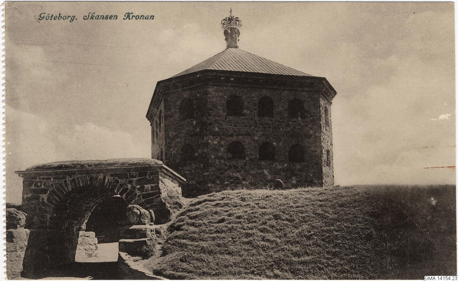 Skansen Kronan mot norr, utanför muren vid porten. På avsatser, i den delvis raserade muren, intill porten de båda lejon som prydde Kungsporten fram till 1939.