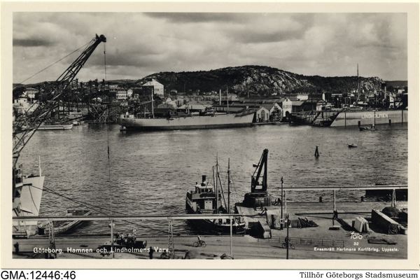 Vy över Göteborgs hamn och Lindholmens varv med Ramberget i fonden.