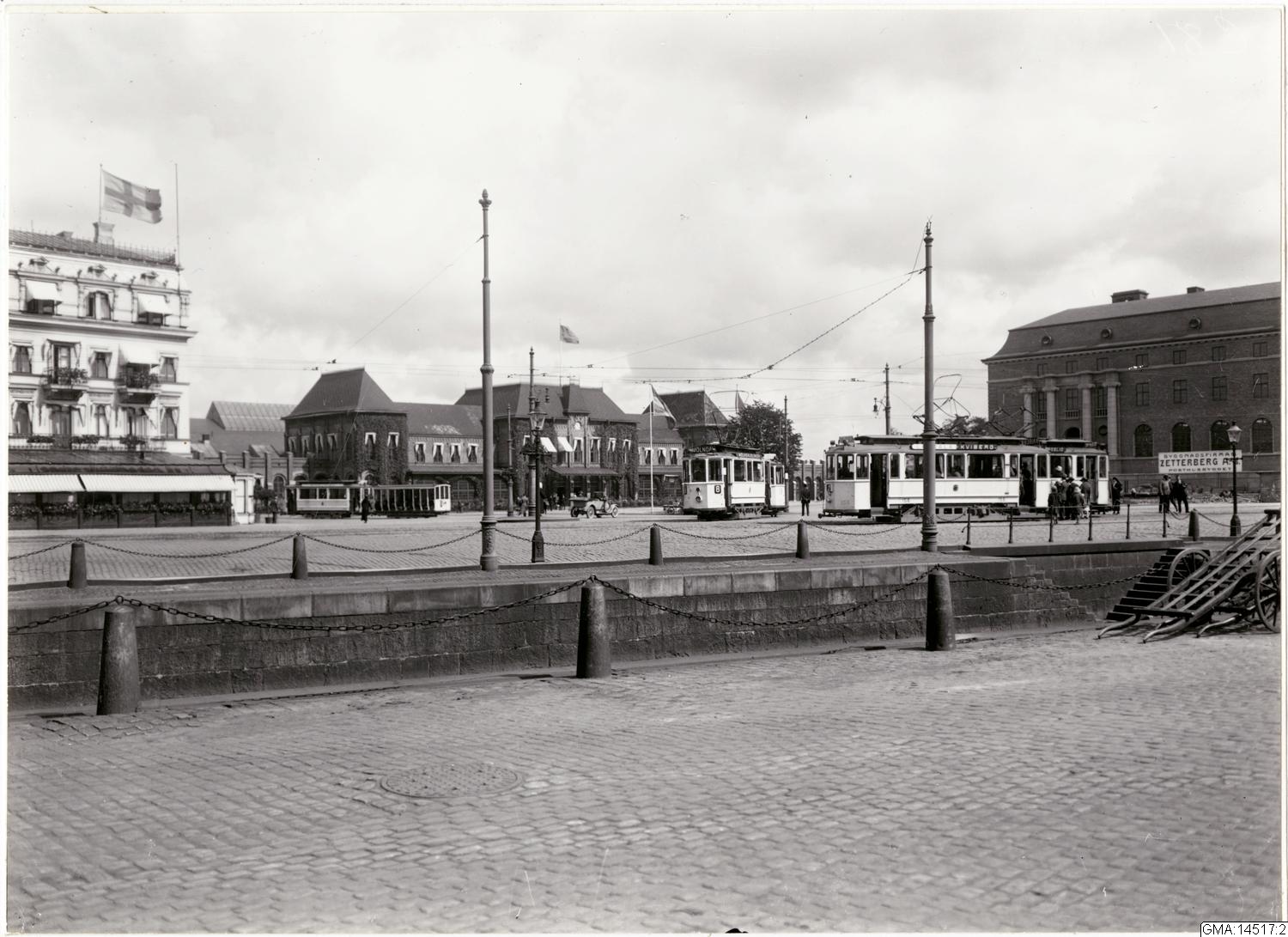 Vy över Drottningtorget med Hotell Eggers, Statens järnvägars stationhus och Posthuset. Bilden tagen 1 år före invigningen av Posthuset, framför byggnaden syns att det ännu är en byggarbetsplats.