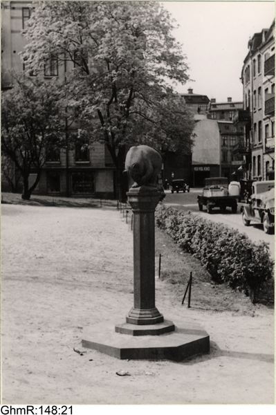 Motiv från plantering och lekplats vid Fjärde Långgatan nedanför Oscar Fredriks kyrka. Till höger Fjärde Långgatan, sträckning mot Masthuggstorget. "Nalle".