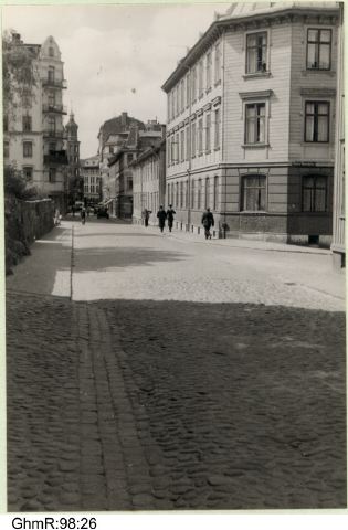 Bergsgatan mot Frigångsgatan. Blick från öster utanför Bergsgatan 17, åt Linnégatan. Närmast t.h. Bergsgatan 10 x Västra Skansgatan 17.