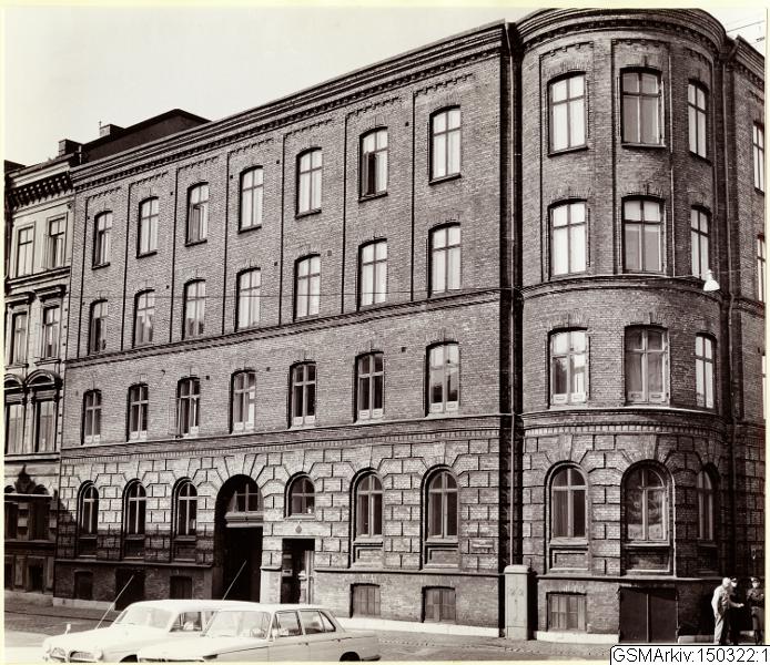 Fotot visar fastigheten korsning Lilla Klädpressaregatan 4 /Norra Larmgatan 1. Huset byggt 1877. Av sten i fyra våningar, genomgående gult tegel. Bottenvåningen rusticerad, de övriga våningarna förbinds av lisener.
