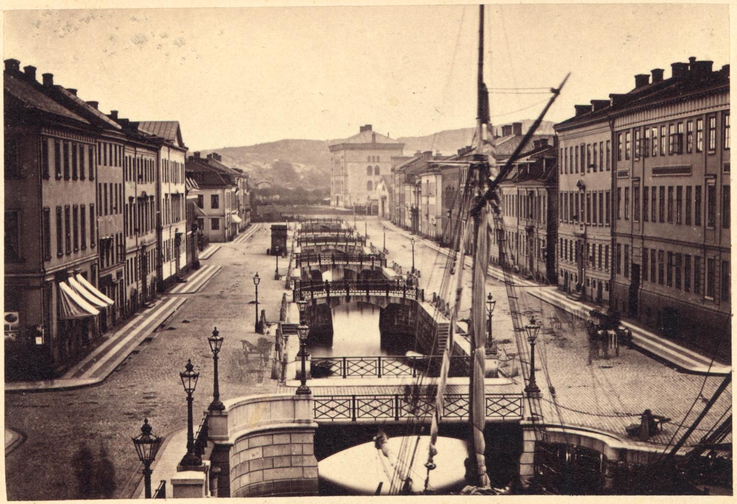 Västra Hamngatan med Västra hamnkanalen mot Söder, sedd från Norra Hamngatan. I fonden Sahlgrenska sjukhuset.