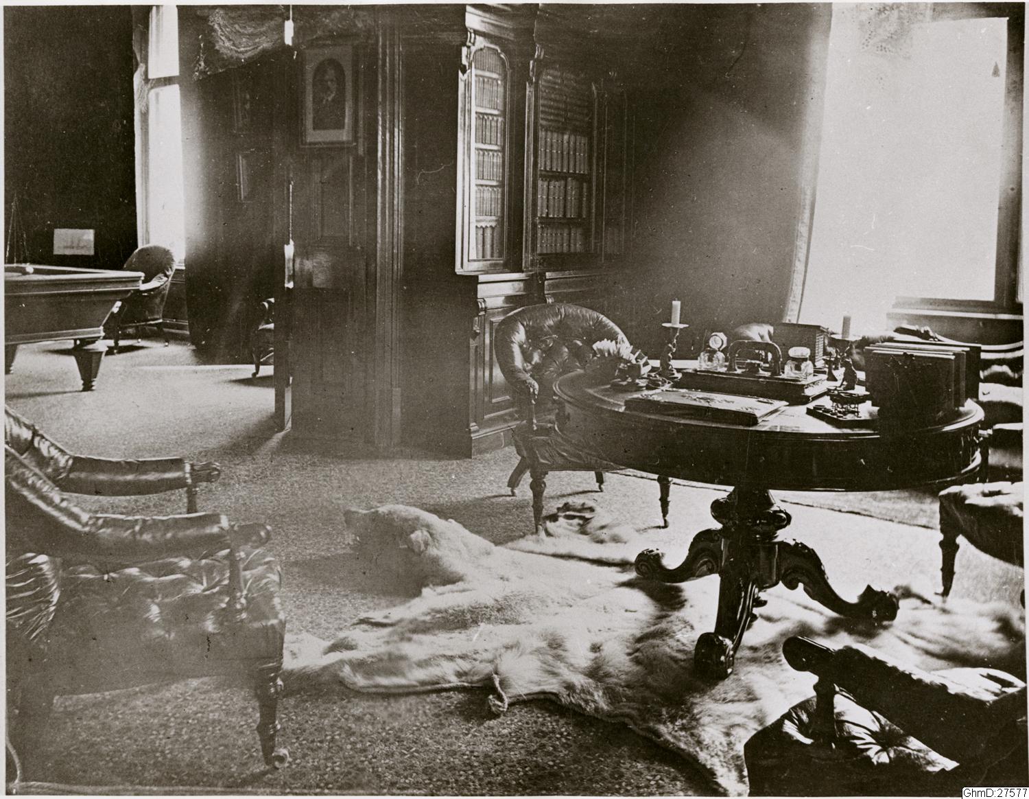 Friherre Oscar Dicksons skrivrum i Dicksonska palatset. Isbjörnen skjuten av Adolf Nordenskiöld under dennes Nordpolsexpeditionen 1874-1875.