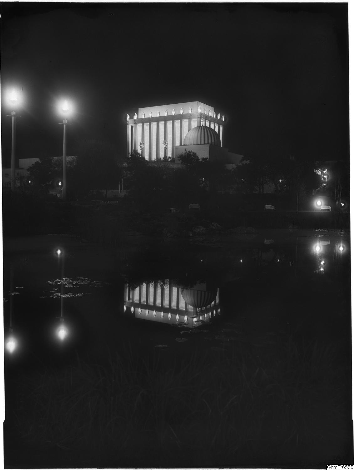 Minneshallen i kvällsbelysning och speglas i Näckrosdammen. Jubileumsutställningen 1923, Bild från utställningsområdet.