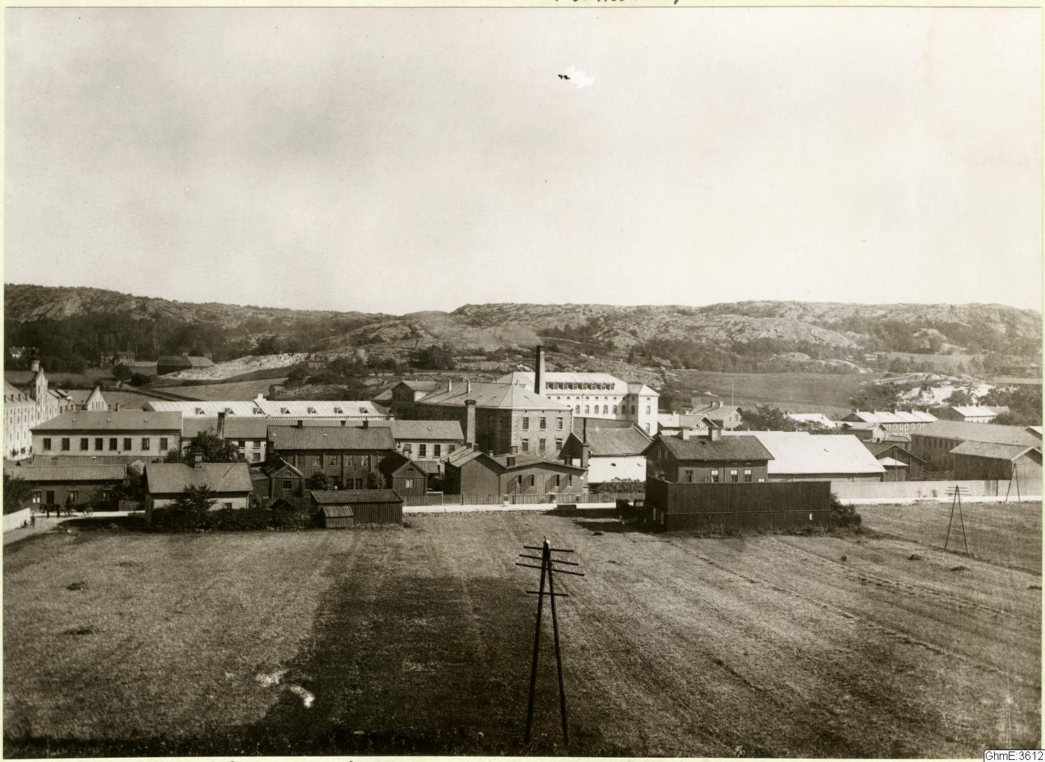 Parti av Mölndalsvägen söderut från den så kallade bomstugan. Till vänster i bild Lyckoholms bryggerier. Byggnaden med de två flyglarna är tekniska fabriken Göta Lejon.