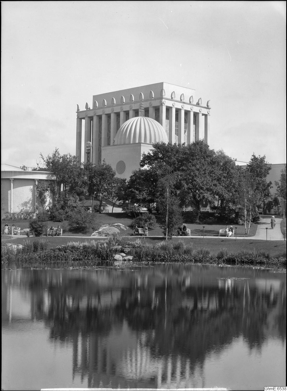 Bild från utställningsområdet vid Johanneberg med Näckrosdammen och Minneshallen. Kupolen tillhör byggnaden för handelns historia.