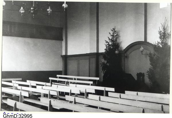 Interiör från den "gudliga salen" i Evangeliska Brödraförsamlingens (Herrnhutarnas) hus (Nikolaisalen, 2:a våningen) vid seklets början (1900).