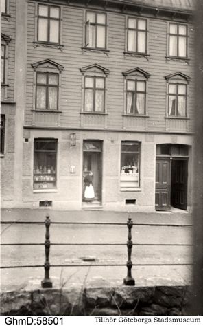 Axel N. Augustsson (1879-1940) var son till lantbrukaren August Johansson på Gunnesby Mellangården i Säve sn. Interiör från ägarens hem se arkivreferens. I dörren står hustrun Ida.