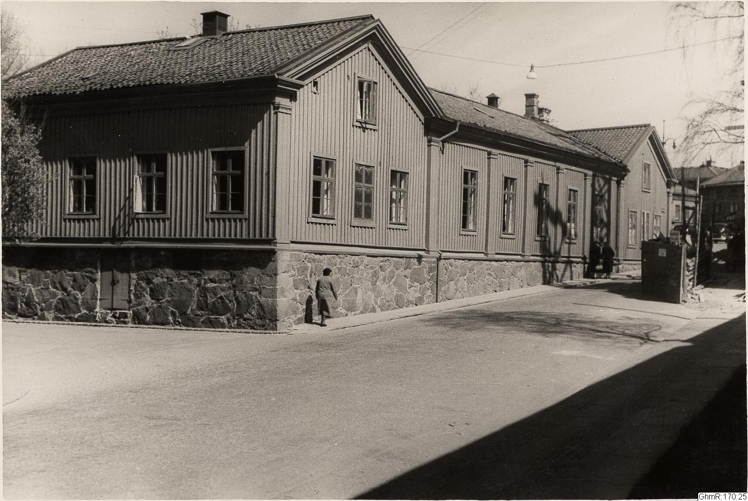 Carlgrenska skola vid Allmännavägen, bilck mot öster. Skolbyggnaden uppförd 1827 som Majornas fattigfriskolan och kalldes Carlgrenska skolan efter föreståndaren pastor Carl Carlgren på 1830-talet.