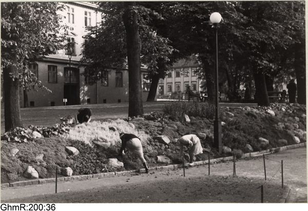Bläsgatan 12 sett genom Gamla Varvsparken, där rensningsarbete pågår. I bakgrunden skymtar Gathenhielmska huset.
