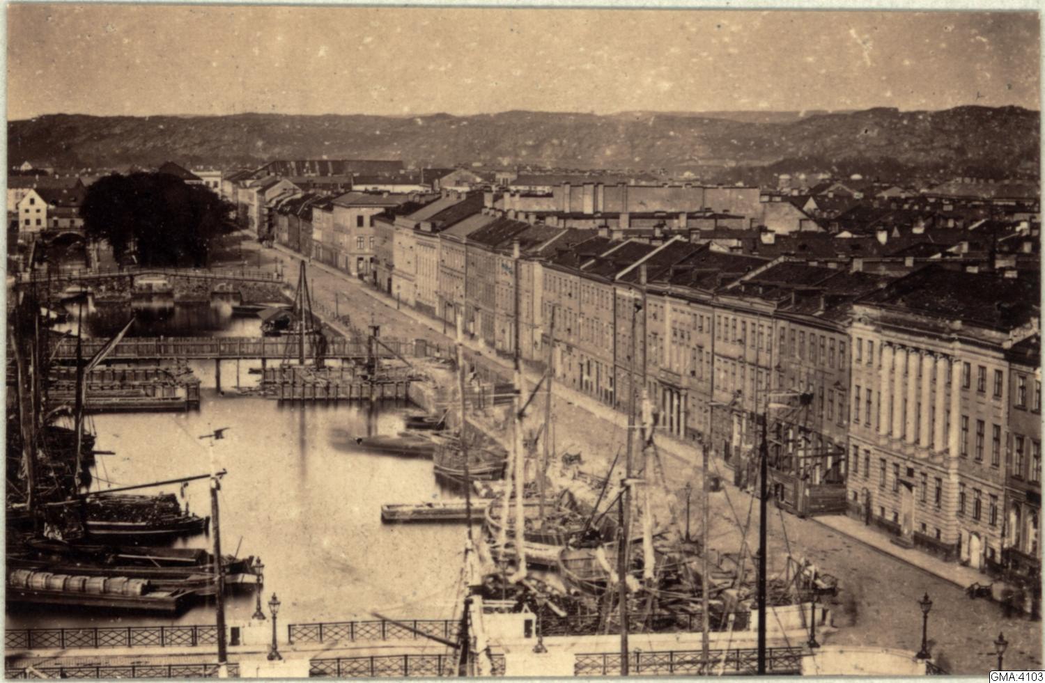 Stora Hamnkanalen och Södra Hamngatan (t.h.) mot öster. I förgrunden Kämpebron. I bakgrunden gamla Lejonbron.