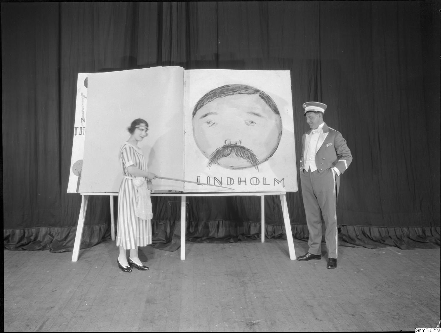 På scenen från utställningens Revyteater, Revyteatern låg bakom Kongresshallen, längs Mölndalån. Namnet Lindholm syftar troligen på Herman Lindholm, lokalpolitiker och direktör för Liseberg.