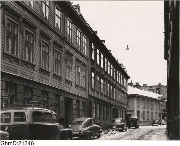 Östra Skansgatan mot söder. Nr 8-12 (trevåningshuset närmast till vänster), därefter nr 16 (tvåningshuset i bildens fond). Foto av John Ingels 1962.