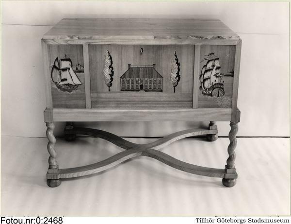 "Denna dokumentkista fick jag på min 50-årsdag d. 26 juni 1938. Skivan är av onyx och intarsian är utförd av Eric Elisen Ljungby. Dokumentkistan är utförd av en elev vid Göteborgs stads lärlingsskolor. J.N."