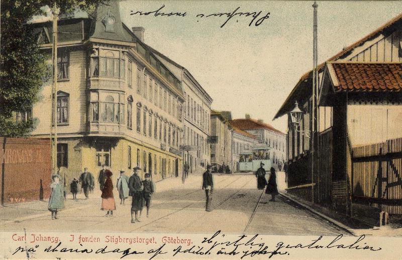 Sträckningsbild av Karl Johansgatan, mynningen vid Stigbergstorget, blick åt öster. T.v. Bläsgatan, rakt fram Stigbergstorget.