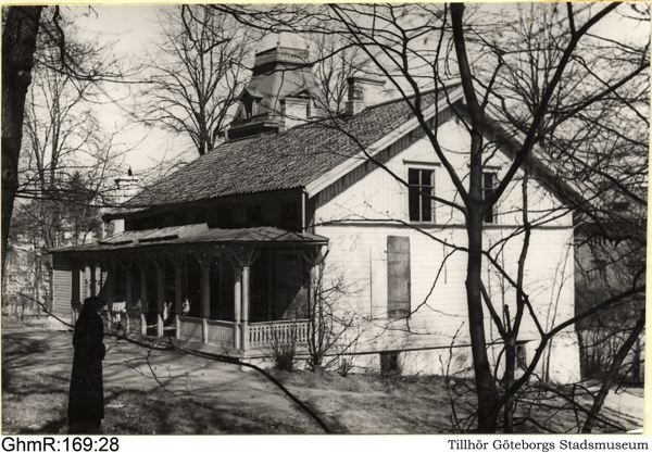 "Gillbladska landeriet", byggnad belägen i sydvästra hörnet av 23 kvarteret Karolinen inom stadsdelen Brämaregården. Kommissarie Hilliard bodde här. Från trädgården. Vy från sydväst.