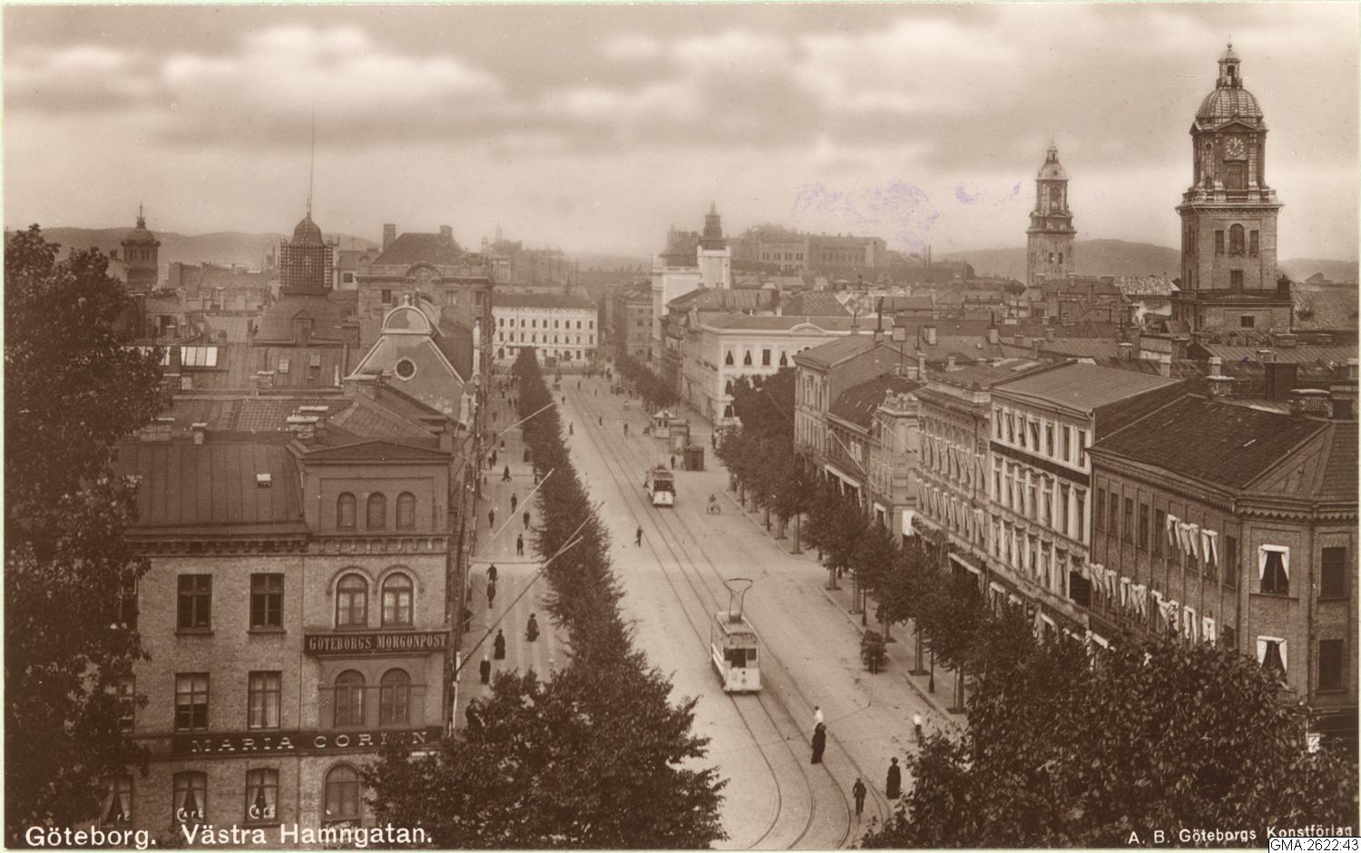 Sträckningsbild längs Västra Hamngatan norrut. Till höger syns tornen till Domkyrkan och Tyska kyrkan. Foto taget från taket på Allmänna och Sahlgrenska sjukhuset vid Grönsakstorget.