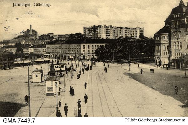 Järntorget åt norr från Linnégatan. T.h. Arbetareföreningens hus. På höjden bebyggelse på Arsenalsgatan.